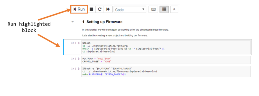 | − | Starting with ChipWhisperer v5.0, tutorials have been moved from the wiki into Jupyter Notebooks. These are located in <code> | + | Starting with ChipWhisperer v5.0, tutorials have been moved from the wiki into Jupyter Notebooks. These are located in <code>software/jupyter</code>, have the extension <code>.ipynb</code>, and can be run by opening the tutorials via the Jupyter Notebook interface. These tutorials contain interactive code blocks, which can run by clicking on them to highlight them, then hitting the run button in the menu at the top of your screen: |
