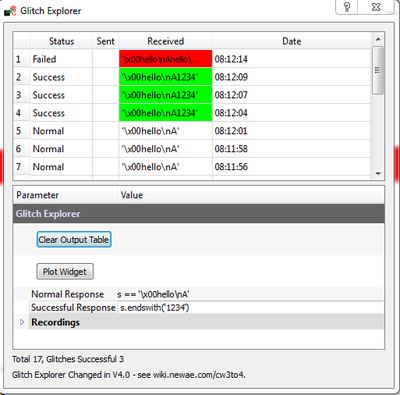 - Press the Capture 1 button a few times. You'll note it records the output of the device, which may not be generating successful glitches (NB: the "offset" and "width" recorded in the table may be wrong when using the Capture 1 button, as the glitch explorer is not recording values from the main GUI correctly. This is a bug in the display only, the correct values are being sent to the device).